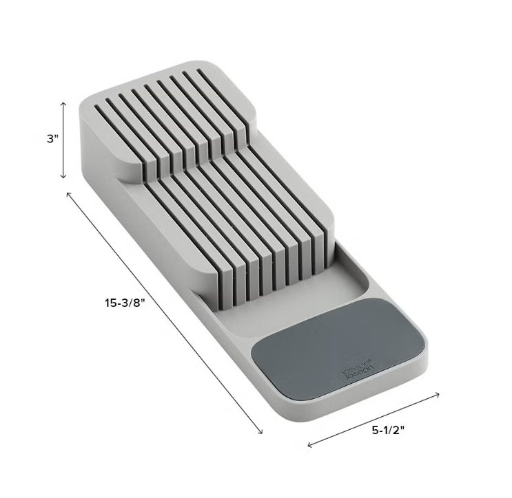Safely store up to 11 knives in this compact, tiered knife organizer. Designed for small and large knives, it keeps blades secure while freeing up drawer space.