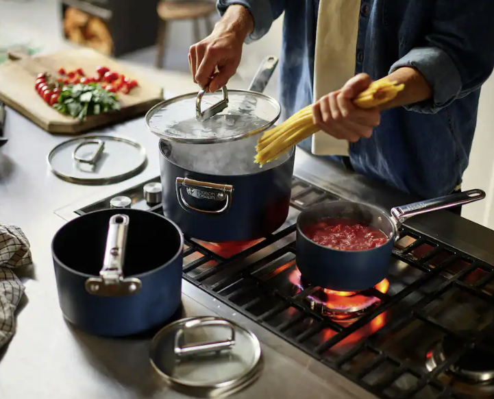 Goodbye clutter, hello Space! The non-stick saucepans nest neatly together and feature clever, folding stainless-steel handles that save up to 50% more space than standard pans when stored. Engineered to last, the handles feature our patented and fail-safe SwingLock™ Mechanism that locks the handles securely into position during use and optimizes space when folded. When it comes to cooking performance there's no compromise either. Professional quality, heavy-gauge aluminum bodies ensure even heat distribution that eliminates hot spots and are built to last. The high performance, ceramic non-stick coating is super durable, easy to clean and allows you to achieve exceptional cooking results. It's healthier to cook with too as it's free from PTFE, PFAS, PFOA, lead and cadmium, which means you can prepare all your favorite recipes with confidence. Each pan comes with a tempered glass lid that also has a folding handle, a smart stacking pan-lid holder and a pair of felt pan-protectors, making compact storage even easier. Suitable for all hob types, including induction.