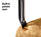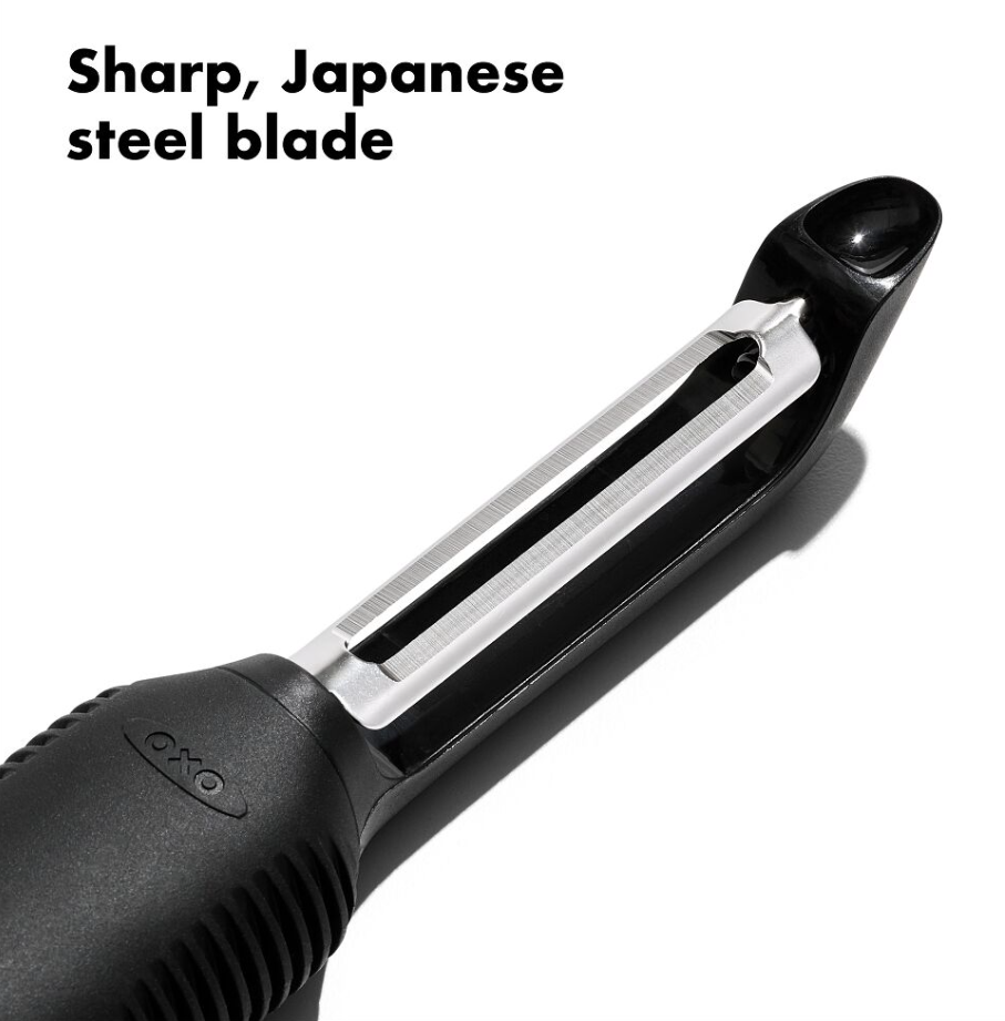 The award-winning OXO Good Grips Swivel Peeler is engineered to stay comfortable through fast, repetitive use. It’s perfect for prepping tough-skinned fruits and vegetables like apples and cucumbers. Two sharp, Japanese stainless steel blades flex to peel large areas with each stroke. The easy-grip handle is designed to work for lefties and righties, and it stays non-slip, even when wet. A durable, built-in potato eyer carves out blemishes without ruining your produce. The handle includes a hole for hanging storage. Rustproof and dishwasher safe. Features Sharp, Japanese stainless steel blade glides over fruits and vegetables Swiveling twin blades flex to peel large areas with each stroke Rustproof construction for long-term use Designed for firm or tough-skinned produce like apples and potatoes Soft, non-slip handle cushions hands for a comfortable grip Built-in potato eyer removes imperfections