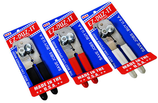 It can be found, for retail purchase, at both large and small brick & mortar stores and on the large, trusted website stores. The Ez-Duz-It can opener comes in black but is also available in red, white and blue. It is USA made and we are damn proud of it.