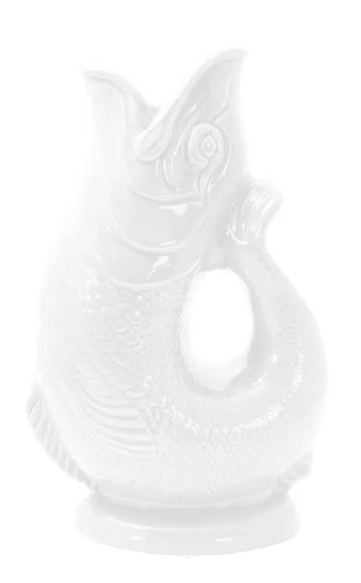 A classic British design since first manufactured in the 1860s, the Mini Gluggle Jug (White) from Wade Ceramics brings a fun and vibrant feel to any tablesetting or decor! The Gluggle Jug is crafted from lead-free, fully vitrified ceramic and is glazed inside and out so it is waterproof and food-safe, providing the famous and entertaining "gluggling" sound whether you use it to add cream to your coffee or water your windowsill herbs. The classic arched fish design features finely detailed fins and scales and the rich Sage Green finish makes a statement anywhere you display it. Use it at the breakfast table as the perfect "Good Morning!" accent to hold warm syrup or bring a touch of whimsy to your countertop by filling it with dishwashing soap and keeping it near the sink. Hand cast, hand dipped, and hand finished with select materials in Staffordshire, England, at the heart of the British ceramics industry, Wade Ceramics Mini Gluggle Jug (White) is ornamental enough to grace the mantle or bookshelf as a decorative piece and durable enough for everyday use as a mini jug, desk organizer, and more!