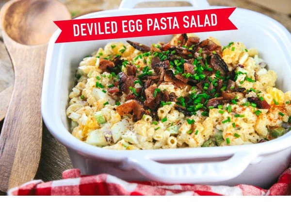 Say hello to deviled egg pasta salad! It’s the perfect mashup of creamy deviled eggs and a hearty pasta salad. Combine tender pasta, chopped hard-boiled eggs, crunchy celery, dill pickle relish with a zesty dressing, and you've got a crowd-pleaser that’s great for BBQs, potlucks, or just a casual weeknight meal. (Did we mention the crumbled bacon on top?)